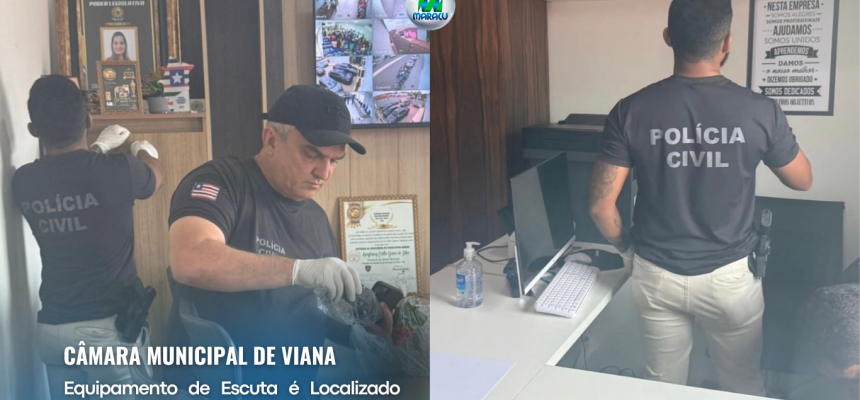 A Polícia Civil apreendeu, na manhã desta segunda-feira (27), um dispositivo de escuta encontrado no gabinete da presidente da Câmara Municipal de Viana, Lauryfrancy Gomes. O aparelho estava oculto em uma estante da sala.