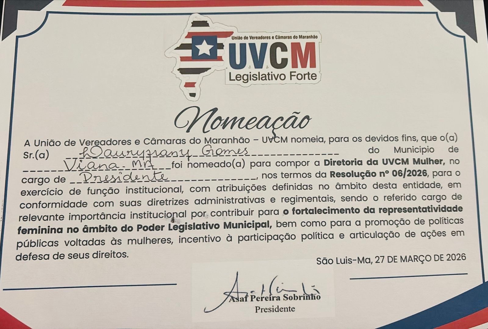 A presidente da Câmara Municipal de Vereadores de Viana, Lauryfrancy Gomes, assume a presidência da UVCM Mulher (União de Vereadores e Câmaras do Maranhão), levando consigo a força, a coragem e a voz das mulheres da nossa terra.